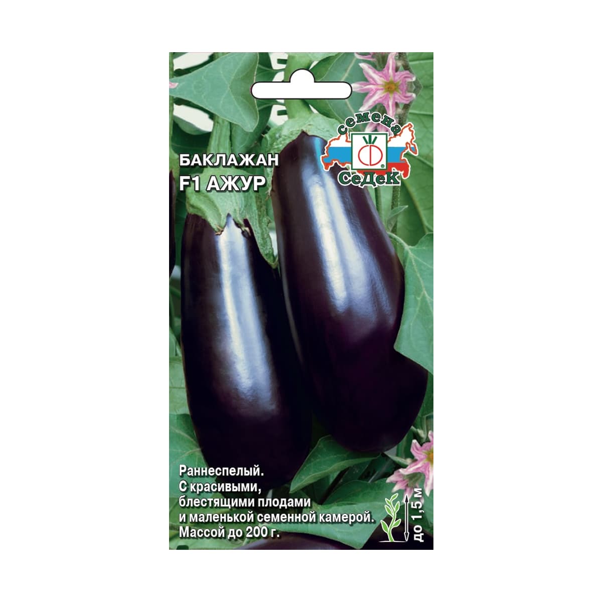 Баклажан гибридный «Ажур F1» (фасовка 0,1 г, производитель «Седек») — раннеспелый высокоурожайный гибрид для выращивания в открытом и защищённом грунте. Период от появления всходов до сбора урожая составляет 95–105 дней, что даёт возможность получать свежие плоды на ранней волне баклажанного сезона. Растение формирует полураскидистый, среднеоблиственный куст высотой до 1,5 м, требующий обязательного формирования и подвязки для повышения урожайности и поддержания структуры куста.