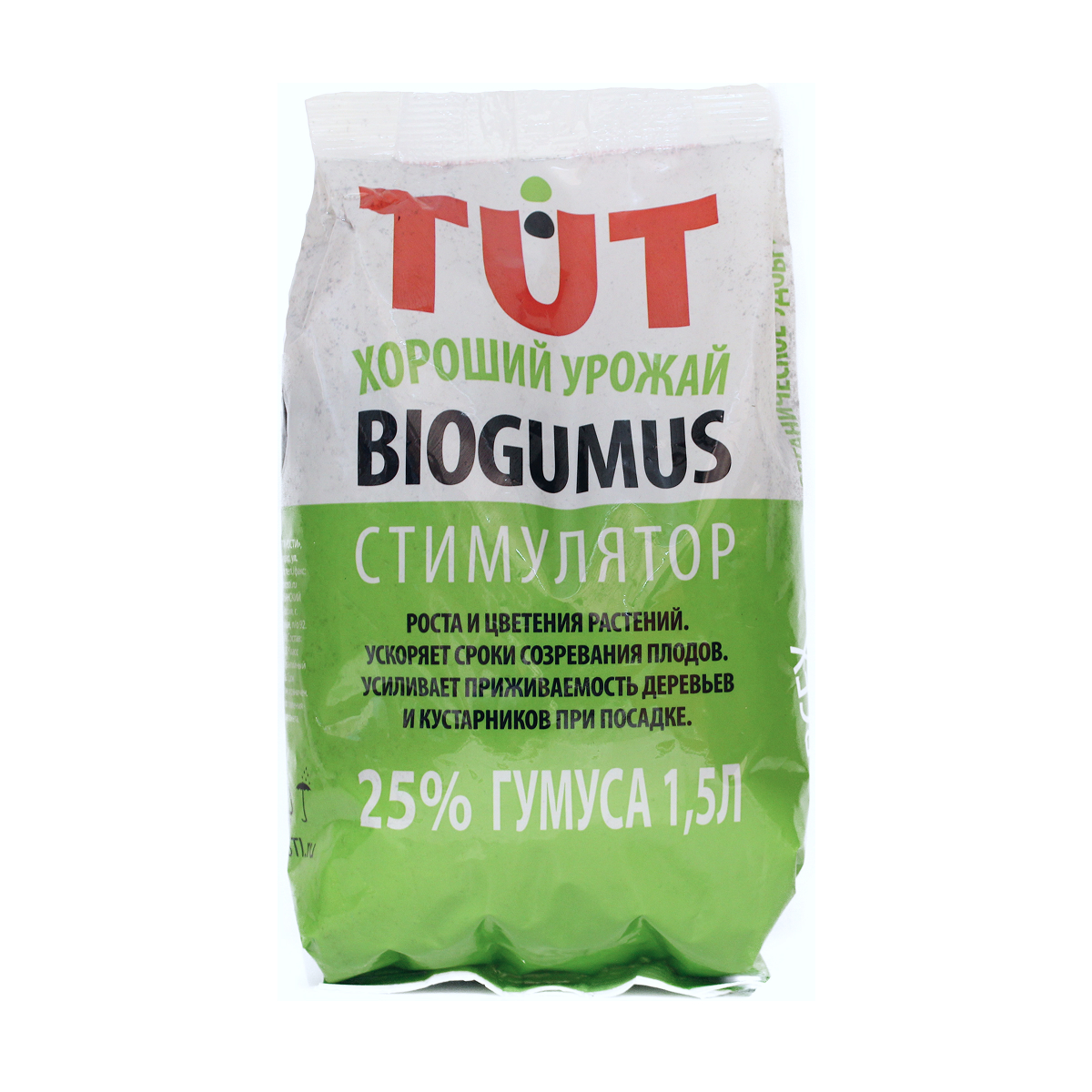 Удобрение выпускается в фасовке по 1,5 литра, расфасовано в пакет, подходящий для сезонного и повседневного применения. Производитель — ООО «ТПК РОСТИ» (Россия), торговая марка TUT BIO. Информация о норме расхода, времени внесения и совместимости размещена на упаковке и в сопроводительных документах.