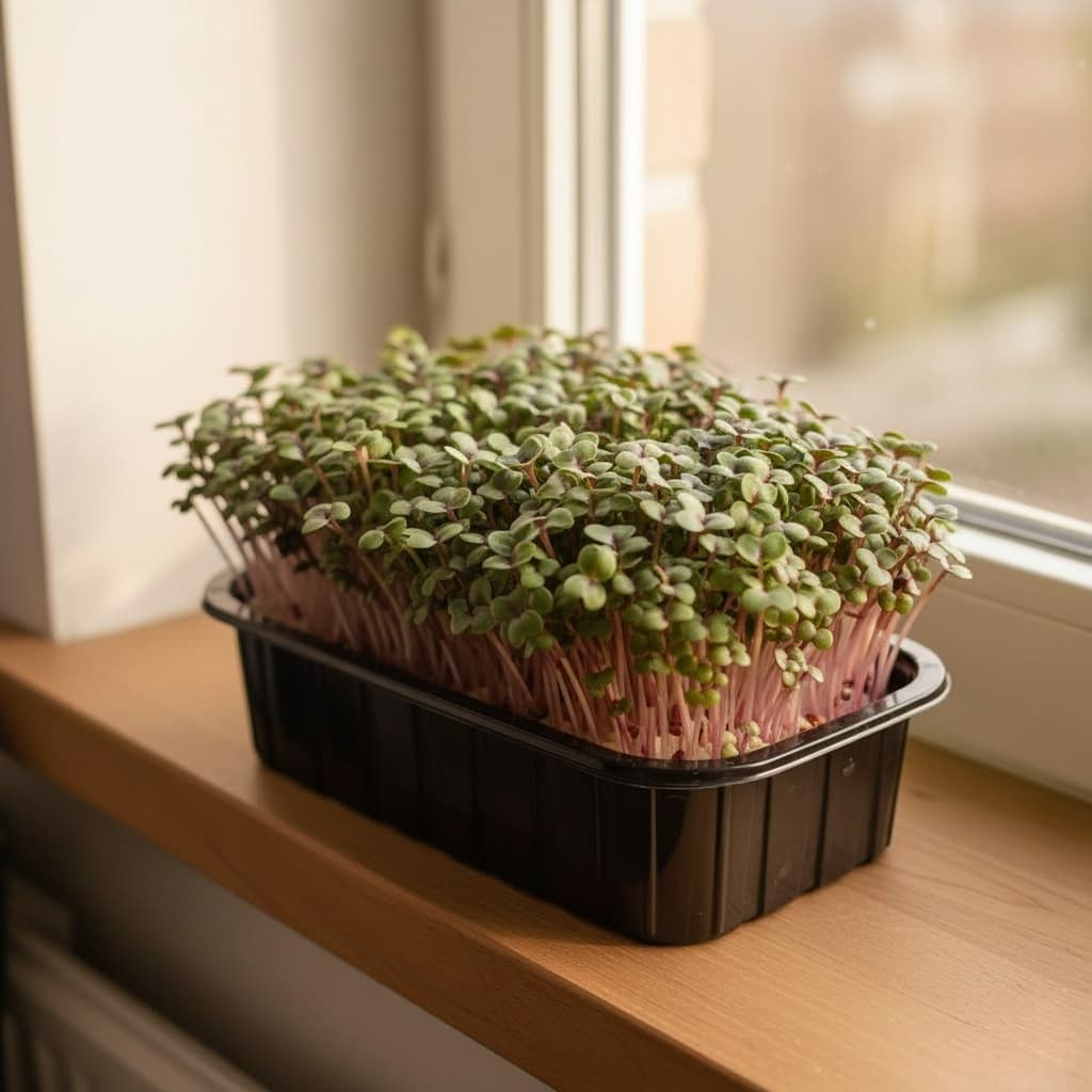 Семена микрозелени горчицы красной дают пикантные, острые ростки с красно-фиолетовыми листьями и зеленоватыми вкраплениями. Микрозелень богата витаминами (A, C, K, группы B), минералами (калий, кальций, железо) и антиоксидантами. Она обладает антибактериальными свойствами, укрепляет иммунитет и сосуды, улучшает пищеварение.