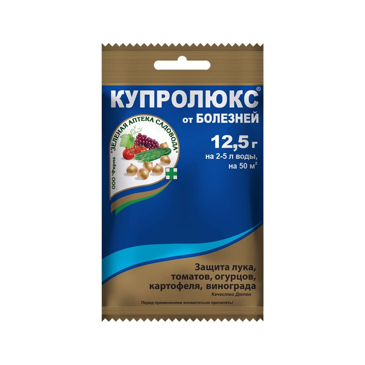 Фунгицид "Купролюкс" (смачивающийся порошок). ДВ: хлорокись меди (689,5 г/кг) + цимоксанил (42 г/кг). Для лечения и профилактики фитофтороза, милдью, ложной мучнистой росы на томатах, огурцах, картофеле, луке, винограде. Хлорокись меди воздействует на патогены контактно, цимоксанил – системно. Обработки с интервалом 10-12 дней (защита 7-10 дней). Максимальное количество обработок за сезон: лук – 4, томат – 2, картофель/виноград/огурец – 3. Рабочий раствор готовят и используют в день обработки, хранению не подлежит. Безопасен для пчел. Класс опасности: 3 (умеренно опасный). Срок ожидания: овощи – 20 дней, виноград – 30 дней. Внешний вид упаковки может отличаться без изменения свойств.