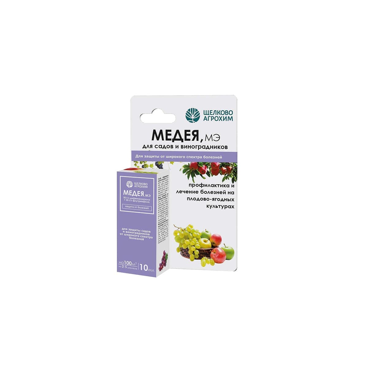 «Медея, МЭ» — комбинированный системный фунгицид для защиты яблони и других семечковых культур от комплекса заболеваний: парши, мучнистой росы, монилиоза, альтернариоза и сажистого гриба. Препарат на основе современных триазолов (например, дифеноконазол + ципродинил) обладает двойным механизмом действия: быстро проникает в ткани растения (через 2 часа), блокируя развитие патогенов на всех стадиях, и формирует длительный защитный барьер (до 21 дня). Ключевые преимущества: выраженное лечащее действие при уже проявившихся симптомах, устойчивость к смыву дождем после высыхания, подавление спорообразования. Применяется профилактически или при первых признаках болезни с интервалом 10-14 дней. Для предотвращения резистентности обязательно чередовать с контактными медьсодержащими фунгицидами. Норма расхода: 5-7 мл/10 л воды. Класс опасности: 3.