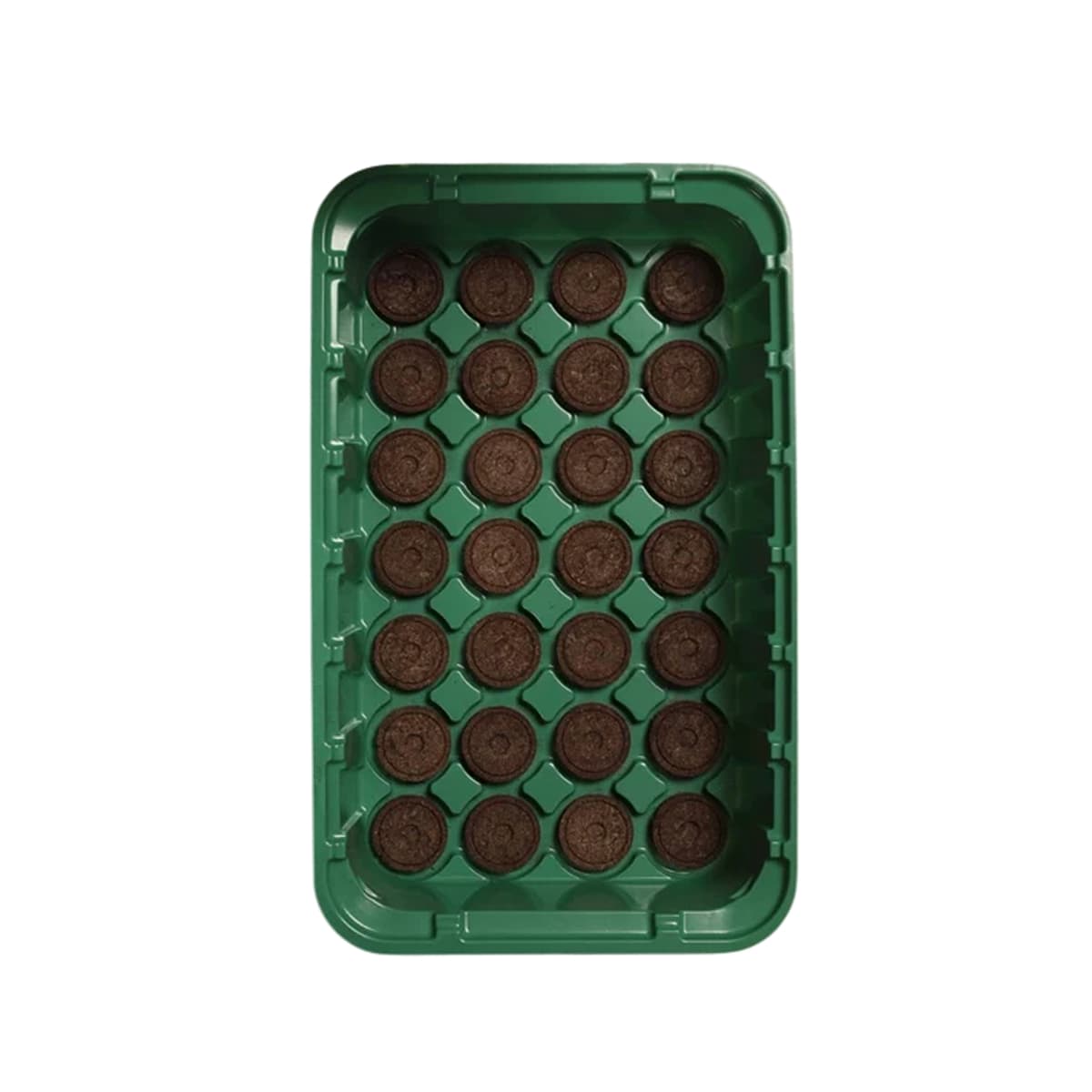 Внутри размещаются 28 торфяных таблеток диаметром 41 мм. Такой размер особенно удобен для семян средних и крупных культур, а также для случаев, когда важно получить рассаду с хорошо развитой корневой системой. Таблетки выполнены из тщательно прессованного торфа с нейтральным pH; при увлажнении они значительно увеличиваются в объёме, превращаясь в рыхлую структуру, оптимальную для прорастания семян, формирования всходов и минимизации риска повреждения корней при пересадке.
