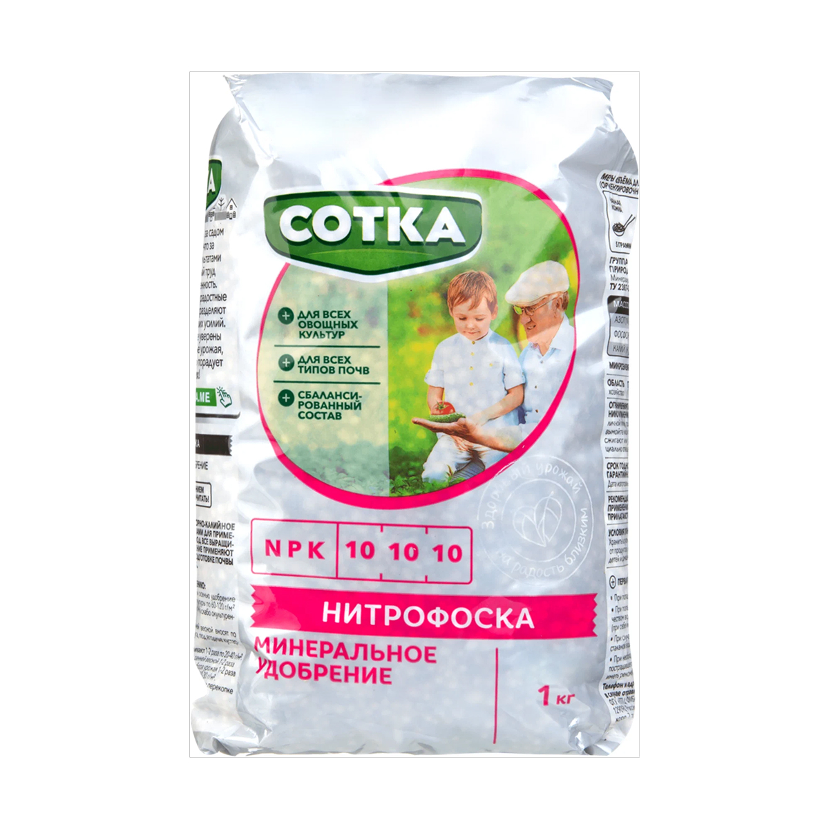 Минеральное удобрение Сотка «Нитрофоска» — гранулированная смесь для комплексного питания садовых и овощных культур. Продукт содержит сбалансированный состав макроэлементов: азот (N), фосфор (P), калий (K), каждый — по 10 % (NPK 10-10-10), в форме, доступной для усвоения растениями на любых типах почв.