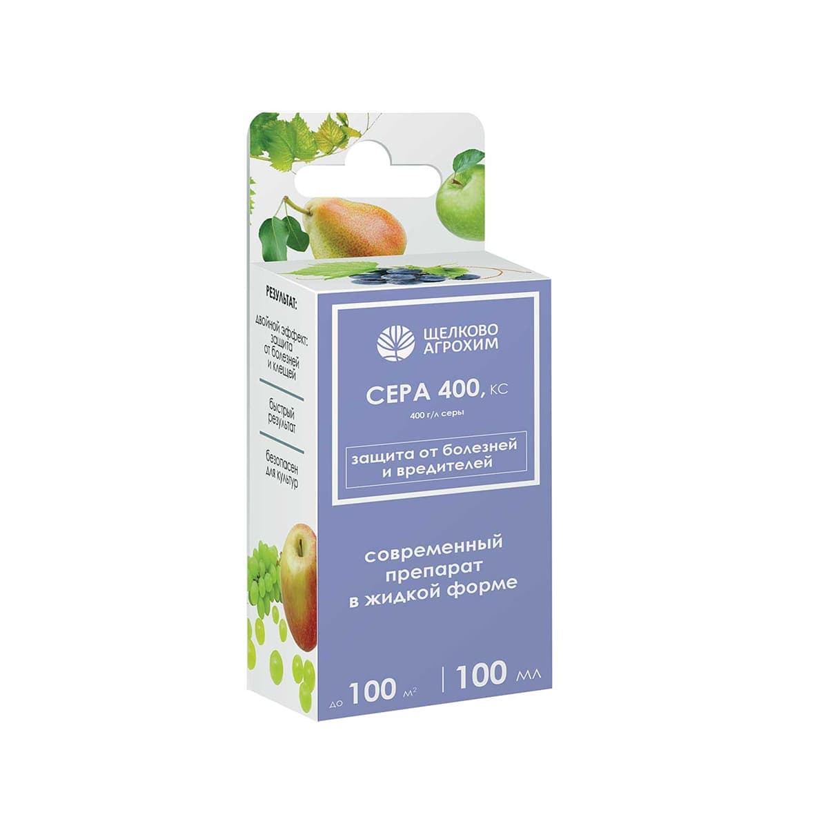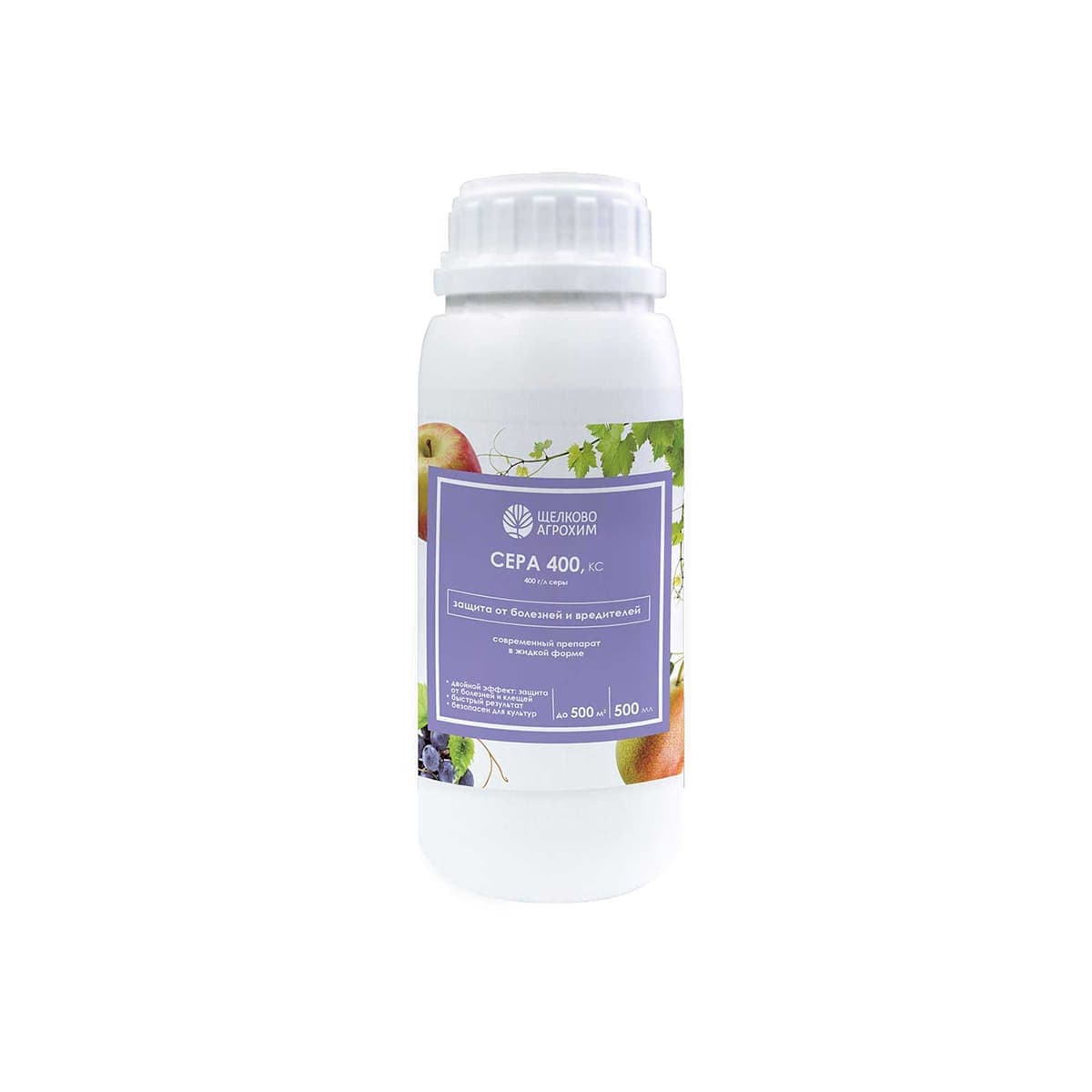 «Сера 400, КС» – фунгицид и акарицид для садов и виноградников. Действующее вещество: сера (400 г/л). Препарат создает защитный барьер, подавляющий прорастание спор грибов и их проникновение в ткани растений. Фунгицидный эффект обеспечивается образованием паров серы и сероводорода, токсичных для патогенов. Дополнительно эффективен против паутинного клеща: под действием солнечных лучей сера переходит в газообразное состояние, уничтожая клещей и их личинки. Применяется для защиты от комплекса грибных заболеваний и клещей на плодовых деревьях и виноградной лозе. Максимальная эффективность против клещей достигается только в солнечную погоду.