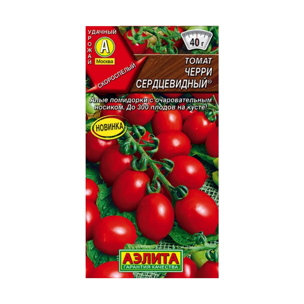 Томат «Черри сердцевидный» («Аэлита»), упаковка — 20 семян. Раннеспелый индетерминантный сорт с вегетационным периодом 105–110 дней от всходов, предназначен для выращивания как в теплицах, так и в открытом грунте. Растение сильнорослое, достигает высоты 1,8 м и выше, формирует длинные кисти, на каждой из которых — 8–10 плодов.