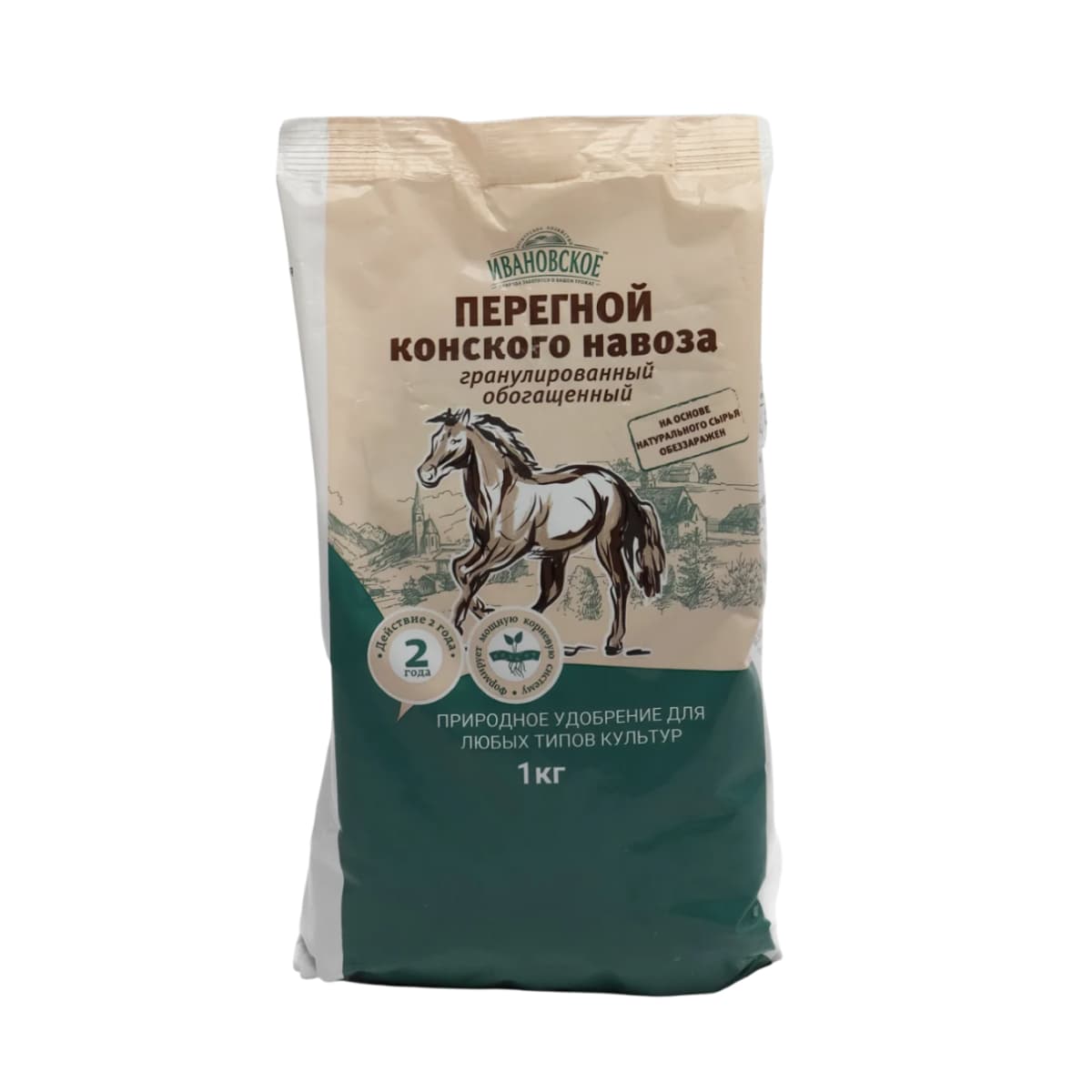 Ивановское «Конский перегной гранулированный» — органическое удобрение, изготовленное из тщательно переработанного конского навоза с последующим гранулированием, что облегчает его внесение и равномерное распределение на участке. Основное предназначение — улучшение агрофизических свойств почвы, увеличение содержания гумуса, а также создание условий для поступления сбалансированного комплекса органоминеральных питательных веществ.