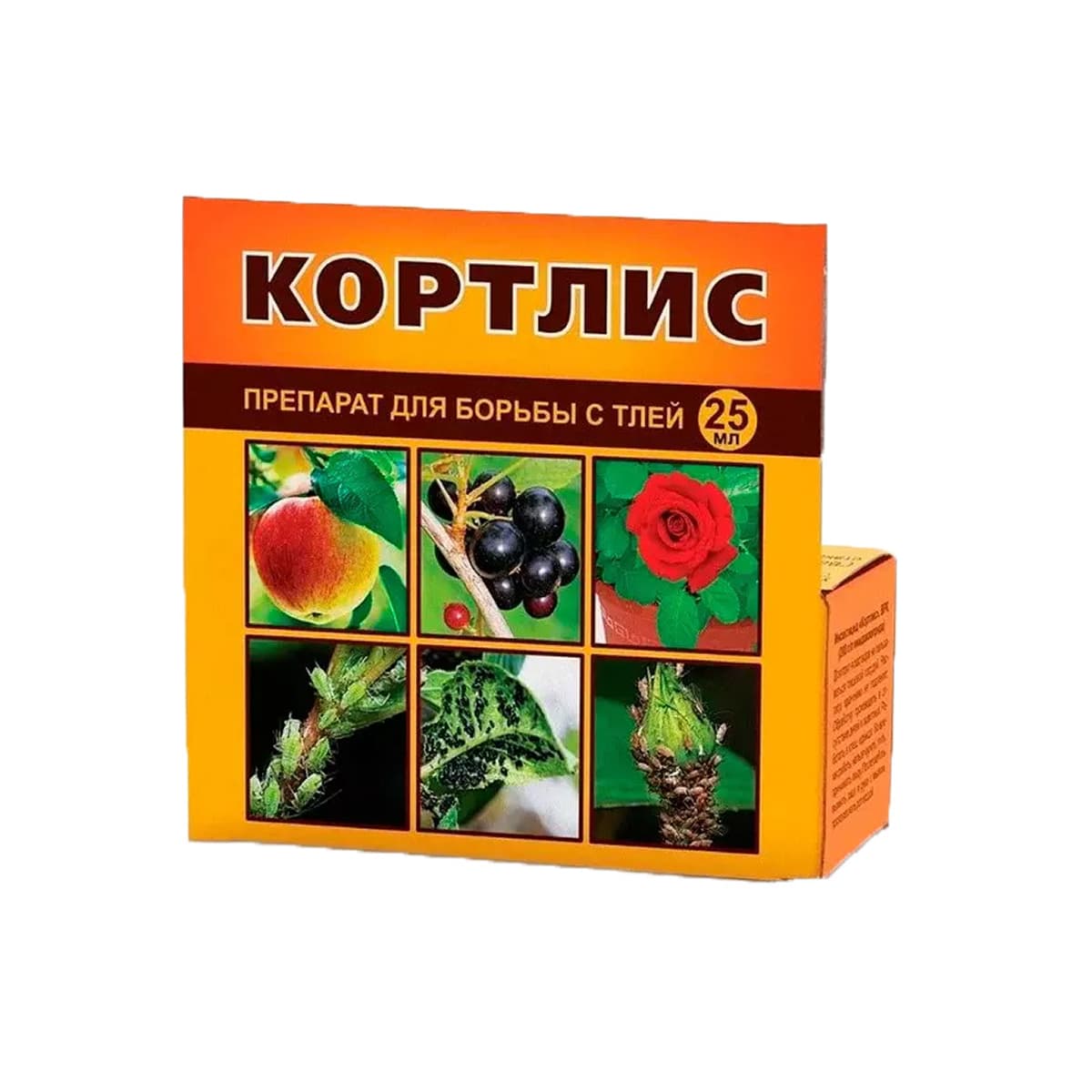 «Кортлис» — системный инсектицид от тли на яблоне, смородине, розах (имидаклоприд 200 г/л). Защита 3-4 недели с эффектом на новые побеги. Дозировки: яблоня (вегетация) — 5 мл/10 л (5 л/дерево); смородина (до/после цветения) — 5 мл/5 л (1.5 л/куст); роза (вегетация) — 2 мл/5 л (10 л/100 м²). Опрыскивать листья до смачивания. Высокоопасен для пчел (Кл. 1)! Запрещено в цветение.