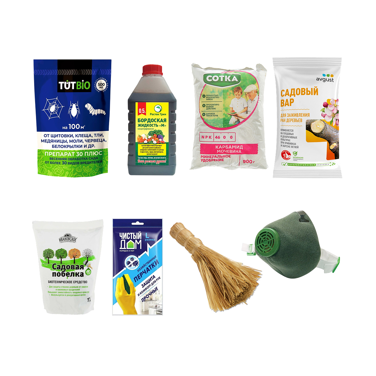 Набор для комплексной первичной обработки плодовых деревьев и кустарников: уничтожения зимующих вредителей, профилактики грибковых заболеваний, подкормки почвы, защиты стволов и обработки повреждений после обрезки.