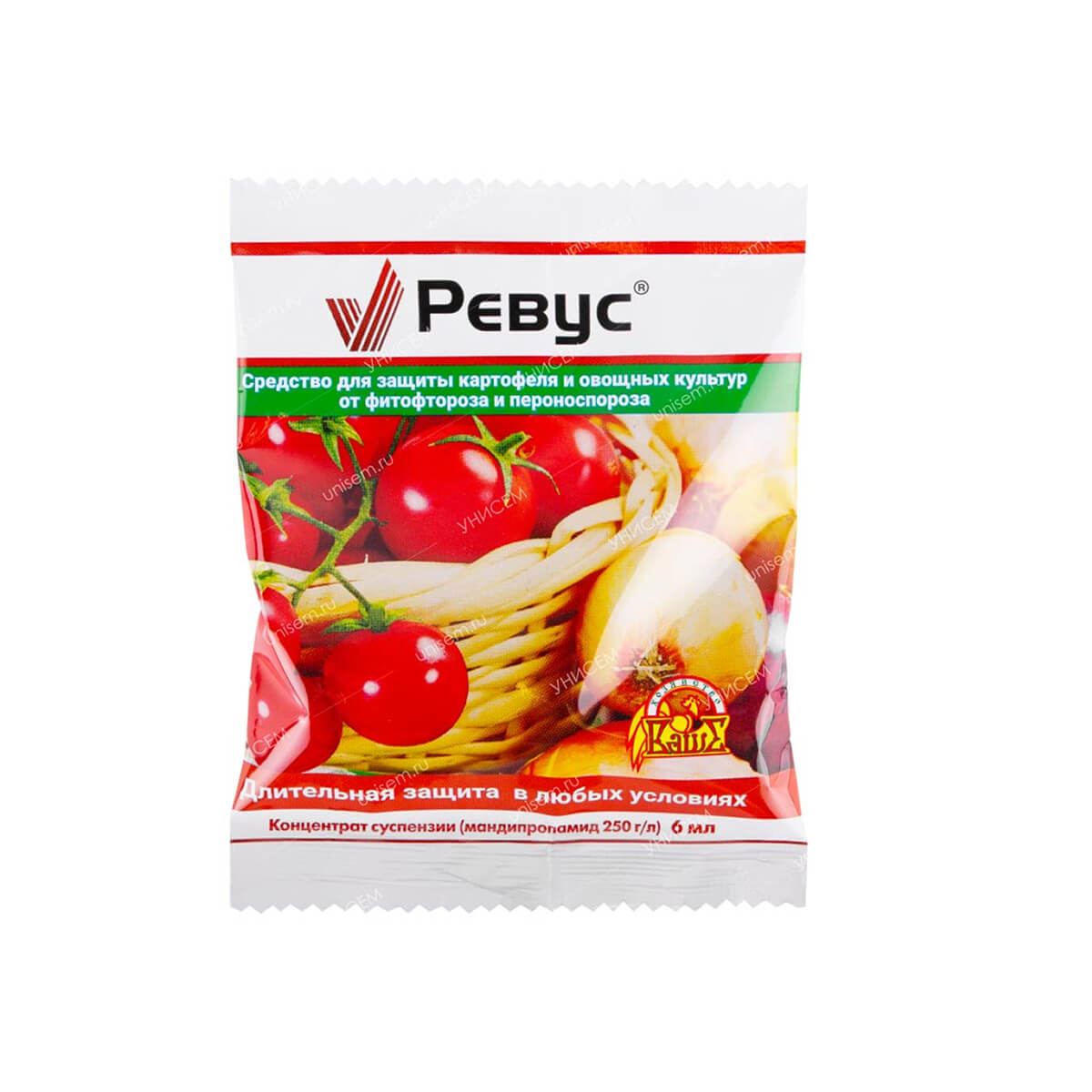 Ревус (Ваше Хозяйство) – фунгицид контактно-системного действия для надёжной защиты овощных культур от фитофтороза и пероноспороза. Обладает высокой дождеустойчивостью (не смывается дождём уже через 1 час после обработки) и длительной защитой благодаря трансламинарному перемещению и лечебной активности. Способствует получению стабильного урожая (особенно лука), нетоксичен для растений в рекомендуемых нормах.
