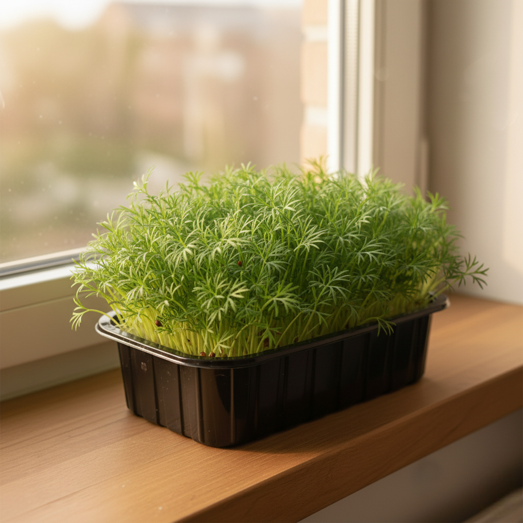 Микрозелень укропа — это молодые побеги, обладающие насыщенным пряно-сладким вкусом и выраженным ароматом свежести. Ростки прекрасно сочетаются с мясом, овощами, добавляются в салаты, смузи и закуски, часто используются для оформления блюд. Их можно проращивать круглый год в домашних условиях или на городских фермах — никаких специальных знаний для этого не требуется, достаточно поддерживать влажность и освещение.